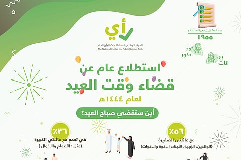 أجرى المركز الوطني لاستطلاعات الرأي العام "رأي"، التابع لمركز الملك عبد العزيز للحوار الوطني؛ استطلاعًا حول كيفية قضاء وقت العيد؛ حيث شاركت في الاستطلاع تلفونيًّا عينةٌ عشوائية بلغ حجمها 1955 مواطنًا ومواطنة، مثّلت نسبة الذكور منهم 44%، والإناث 56%.