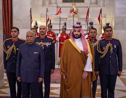 وقد أقام رئيس جمهورية الهند حفل عشاء احتفاءً بزيارة سمو ولي العهد، حيث عُزف السلامان الوطنيان السعودي والهندي في بداية الحفل.