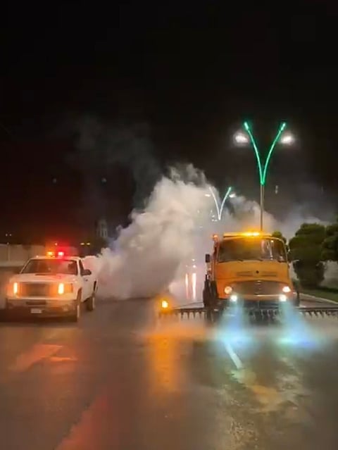 وقد تم تجهيز وتعديل صهريج يتناسب مع عملية التعقيم يقوم بغسل ورش الشوارع بالمعقمات؛ حيث جرى الاستفادة من من وقت "منع التجول" للقيام بعملية التطهير.
