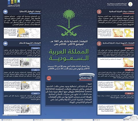 أصدرت الهيئة العامة للأرصاد وحماية البيئة، التوقعات الفصلية على المملكة لشتاء هذا العام 1441هـ، والذي يبدأ فكليًّا في يوم الاثنين 22 ديسمبر 2019، وينتهي يوم الأحد 20 مارس 2020م، وشملت توقعات درجات الحرارة السطحية والتوقعات الشهرية، وكذلك توقعات هطول الأمطار.