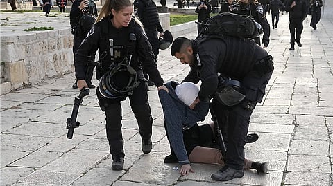في هذه الصورة التي نشرتها وكالة "أسوشيتيد برس" نشاهد تعاملاً وحشيًّا إسرائيليًّا مع امرأة فلسطينية عزلاء في باحة المسجد الأقصى، وذلك مع استمرار الاستفزازات الإسرائيلية لمشاعر ملايين المسلمين حول العالم في شهر رمضان المبارك.