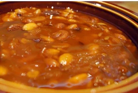 وتابع: تبدأ ربة البيت في تقطيع القمر إلى أوصال ثم ينقع في كمية من الماء الساخن ثم تبدأ في تسخين السمن وتضع حبات قلادة التمر ، ويتم كذلك تحمير اللوز الحجازي ثم تتولى عملية وضع المكونات الأخرى في قدر الطهي ويتم تقليب المكونات حتى تنضج تمامًا.