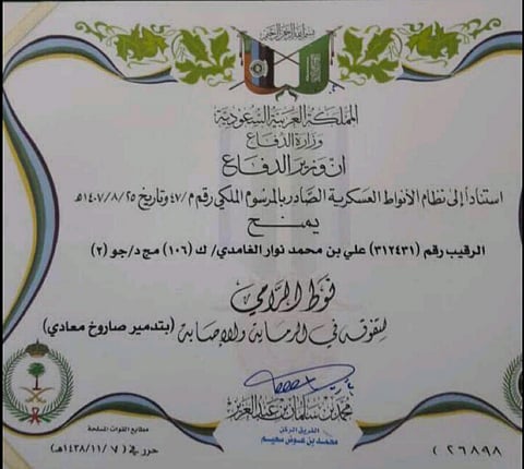 منحت وزارة الدفاع، الرقيب علي بن نوار الغامدي، نوط الرامي، بعد تصديه وإسقاطه للصاروخ المُعادي، المتجه صوب منطقة مكة المكرمة، قبل أيام قليلة.