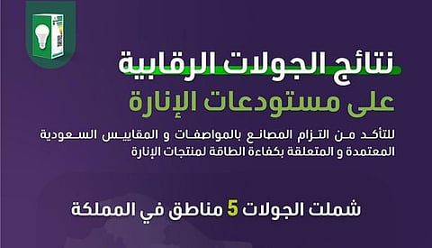 نفّذت 5 جهات حكومية 127 زيارة لمستودعات بيع الإنارة؛ للتأكّد من التزام المصانع بالمواصفات والمقاييس السعودية المعتمدة والمتعلقة بكفاءة الطاقة لمنتجات الإنارة.