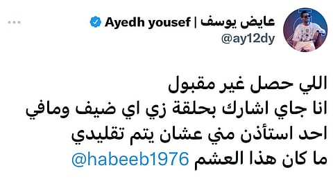 وقال عائض في تغريدة له: "اللي حصل غير مقبول.. أنا جاي أشارك بحلقة زي أي ضيف وما في أحد استأذن مني عشان يتم تقليدي، ما كان هذا العشم".