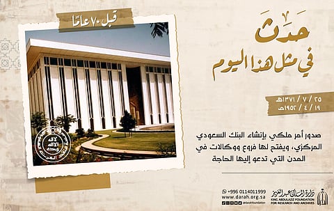 ونشرت دارة الملك عبدالعزيز في حسابها على تويتر تأريخاً لهذا اليوم؛ مشيرة إلى أنه في عام 1952 الموافق 1371 هجرية، صدر أمر ملكي بإنشاء البنك المركزي السعودي، وفتح فروع ووكالات له بكل المدن، وفق الضرورة.