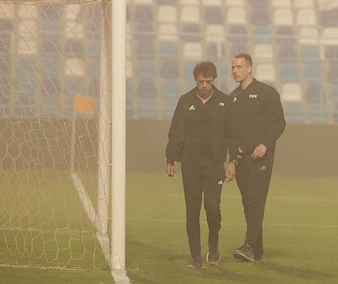 وأدت العاصفة التي غزت الأجواء بشكل غير معتاد إلى انعدام الرؤية وسط مخاوف من إلغاء إقامة المباراة أو تأجيلها؛ وهو ما دفع طاقم التحكيم البيلاروسي المكلف بإدارة المباراة إلى تفقد أرضية الملعب قبل اتخاذ قراره في انطلاق المباراة أو تأجيلها.