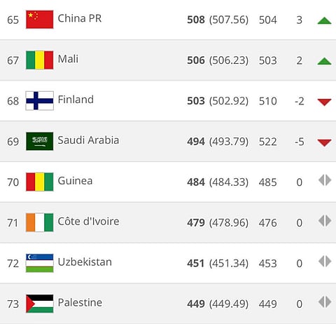 تراجع المنتخب السعودي الأول لكرة القدم خمسة مراكز على سلم تصنيف الاتحاد الدولي لكرة القدم "فيفا" وحل في المرتبة الـ69 عالمياً عن شهر مارس الجاري بـ494 نقطة، والسادس آسيوياً.