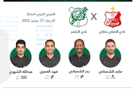 كلف الاتحاد الليبي لكرة القدم طاقم تحكيم سعودي لإدارة مباراة أهلي بنغازي مع نادي الأخضر والنصر ضمن الجولة الخامسة والأخيرة من المرحلة النهائية من الدوري الليبي الممتاز، للموسم الرياضي الجاري (2021-2022)، والتي تُقام منافساتها على الأراضي التونسية.