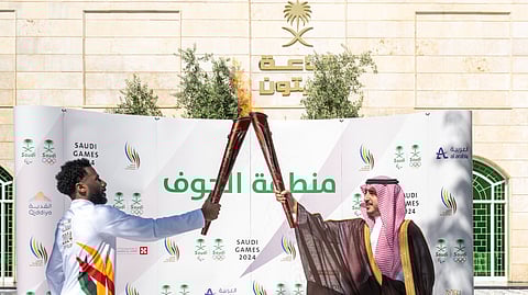 جاء ذلك عقب تسلّم أمير منطقة الجوف، اليوم الاثنين، شعلة دورة الألعاب السعودية 2024، من لاعب ألعاب القوى يوسف مسرحي صاحب ذهبية سباق 400 متر في أسياد 2023، والتي استلمها من ابتسام العنزي من أوائل المؤسسين للجمعيات الرياضية بالمملكة، عضو اللجنة النسائية بالاتحاد السعودي لكرة اليد للمناطق الشمالية، حاصلة على جائزة التميز للشباب العربي من مجلس وزراء الشباب والرياضة العرب.