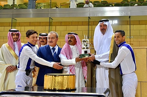 وبعد نهاية الشوط سلَّم الأمير بندر بن خالد الفيصل، رئيس مجلس إدارة نادي الفروسية، كأس المؤسس لمطلق بن مسلم أبو اثنين المشرف الإداري لإسطبل الأمير سعود بن سلمان بن عبدالعزيز.