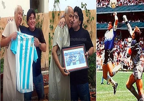 وأرفق "مارادونا" الصور بعبارة قال فيها: "زرت تونس في عطلة هذا الأسبوع والتقيت مجدداً في مقابلة مؤثرة للغاية بـ"علي بن ناصر"، حكم مباراتنا ضد إنجلترا في مونديال المكسيك 1986، وأهديته قميصاً للمنتخب الأرجنتيني، وقدم لي صورة يضعها في منزله تذكاراً لتلك المباراة، كتبت له على القميص: (أهديه لعلي.. صديقي الأبدي)".