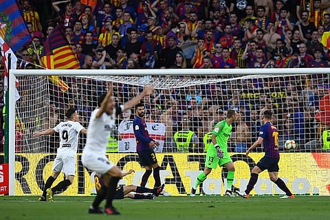 تقدم فالنسيا بهدفين في الشوط الأول عبر الفرنسي كيفن غاميرو (21) ورودريغو مورينو (33) قبل أن يقلص الأرجنتيني ليونيل ميسي (73) الفارق لبرشلونة الذي عجز أن يصبح أول فريق في تاريخ المسابقة يحرز اللقب 5 مرات تواليًا.