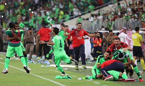 وصال وجال لاعبو الأهلي بعد إطلاق الحكم صافرة نهاية المباراة، احتفالاً بتحقيق لقب غاب عن خزائن النادي الأهلي أكثر من 30 سنة.
