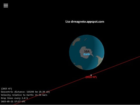 وبحسب وكالة ناسا، سيكون هذا الاقتراب نحو الساعة 17:30 بتوقيت غرينتش 21 مايو، حيث سيمر الكويكب المُسمى 2025 KF على مسافة 115 ألف كم (71700 ميل) فقط من الأرض.