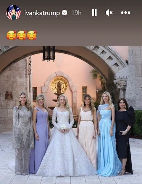 وتُظهِر الصورة الأصلية المذيعة السابقة بشبكة "فوكس نيوز"، بجانب: إيفانكا، وميلانيا ترامب زوجة الرئيس السابق، ووالدة تيفاني مارلا مابلز، ولارا ترامب زوجة إريك ترامب، مع العروس خلال الحفل الذي أقيم السبت.