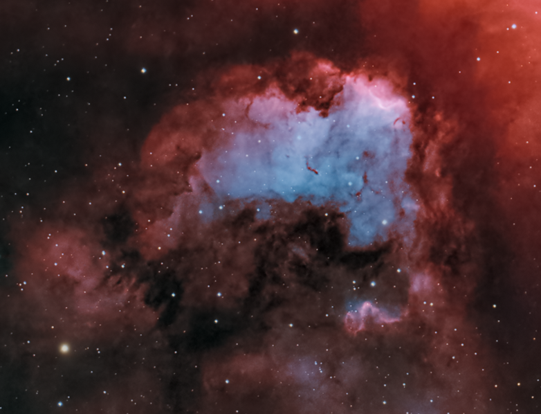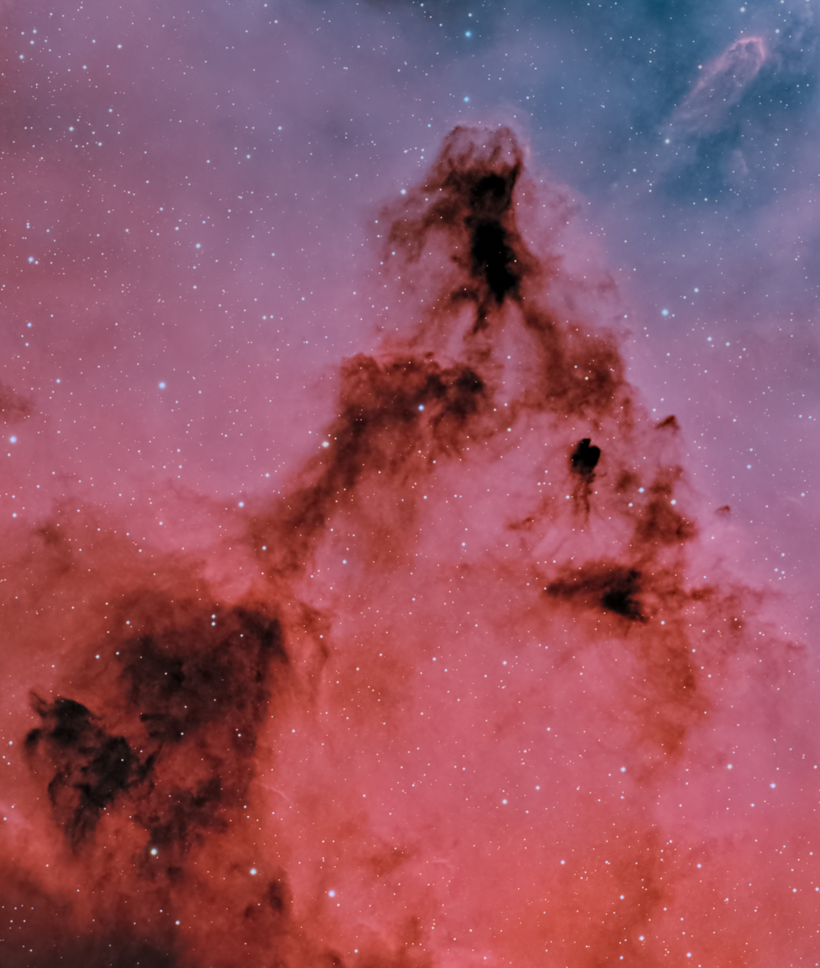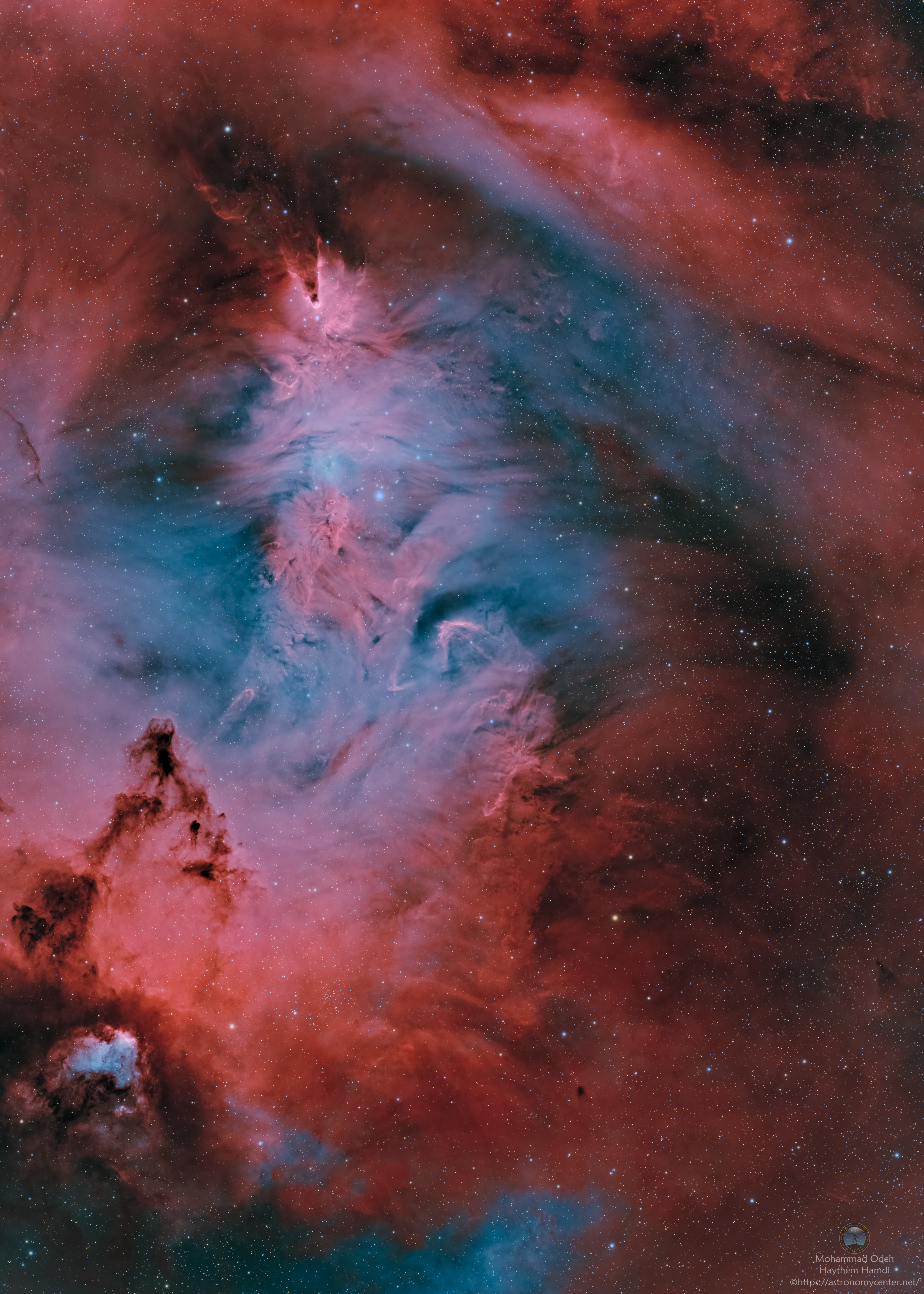 وبيّن أن اللونين الأحمر والزهري في الصورة ناتجان عن تأيّن غاز الهيدروجين، في حين يعود اللون الأزرق إلى تأيّن غاز الأكسجين. كما تُظهر الصورة معالم فلكية أخرى، من بينها سُدم مظلمة، وهي كتل عملاقة من الغاز والغبار تحجب الضوء خلفها، فتبدو على هيئة بقع سوداء.
