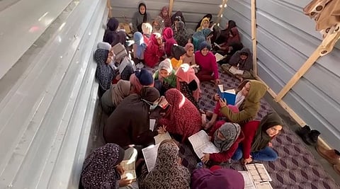 وفي هذه الصورة المتداوَلَة نشاهد عددًا من الفتيات الفلسطينيات قررن تحدي آلامهن، والظروف الإنسانية الصعبة؛ إذ أقمن حلقات لتحفيظ القرآن في الخيام التي نزحن إليها بعد تهدُّم مساكنهن من جراء القصف الإسرائيلي المتواصل.