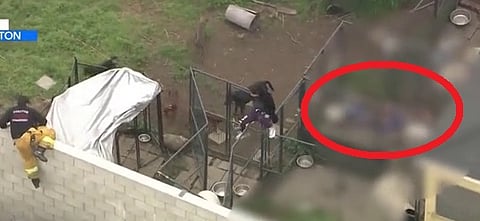 ثم نزلت الشرطة ورجال الإطفاء ومراقبة الحيوانات من مروحية إلى المنزل، وتسلقوا السطح للوصول إلى الفناء واعتقال الكلاب.