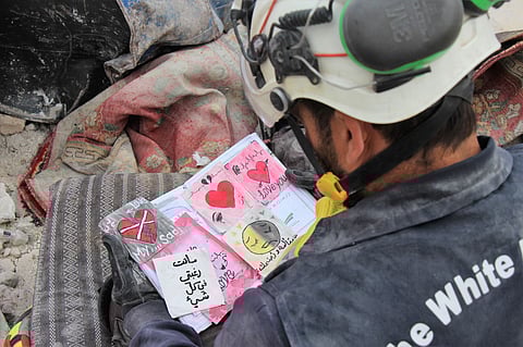 في هذه الصورة التي نشرتها وكالة "رويترز" يطالع أحد أفراد منظمة "الخوذ البيضاء" دفتر مذكرات عثر عليه تحت أنقاض أحد المباني المدمرة في منطقة جنديرس في حلب، في أعقاب الزلزال المدمر الذي ضرب البلد العربي.