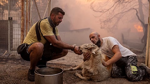 في الوقت الذي تجتاح فيه حرائق الغابات المستعرة اليونان لليوم الخامس على التوالي، وتزحف نحو العاصمة أثينا، كان هذا المشهد الإنساني من مجموعة من المتطوعين بإنقاذهم الخراف، وإرواء عطشهم، ما يمثل النقطة المضيئة في يوم صعب على البلاد.