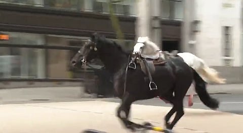 وأظهر مقطع فيديو على منصة "إكس" حصانَيْن يحمل كل منهما سرجًا ولجامًا؛ أحدهما أبيض ومضرج بالدماء، والآخر أسود، يركضان بسرعة كبيرة على إحدى الجادات، ويتجاوزان دراجة "سكوتر"، ويبدوان للحظة يصطدمان بسيارة أجرة بعد تجاوزهما إشارة المرور.