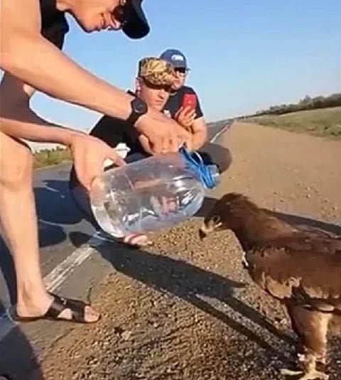 ويُظهر المقطع الرائع الذي تبلغ مدته 20 ثانية ثلاثة رجال على طريق سريع، ويقوم أحدهم بسكب الماء من زجاجة على منقار النسر الظمآن. ويفعل الرجل هذا بعناية وببطء، بينما يقف الاثنان الآخران متفرجَيْن على المشهد أمامهما.