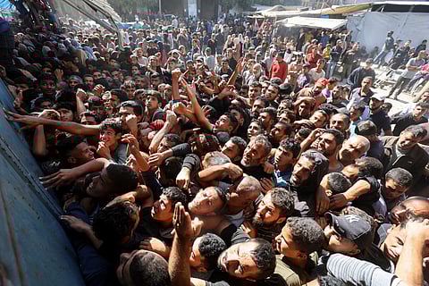 في هذه الصورة التي نشرتها وكالة "رويترز"، نشاهد صفوفاً طويلة من الجائعين من سكان غزة يتدافعون بحثاُ عن كسرة خبز تسد رمقهم في مشهد مأساوي حزين.
