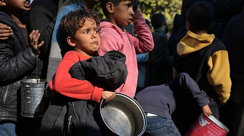 في هذه الصورة التي نشرتها وكالة "أسوشيتد برس"، نشاهد مجموعة من أطفال غزة بعيون دامعة يصطفون للحصول على القليل من الطعام، بعد أن باتت أبسط حقوقهم في الحصول على ما يسد رمقهم هدفاً بعيد المنال.