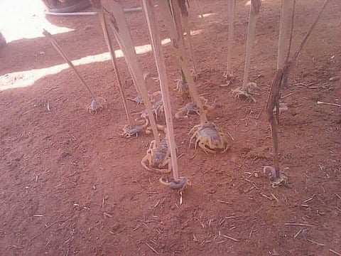 ونشر رواد موقع التواصل الاجتماعي فيسبوك من مدينة إدفو (شمالي أسوان) صورة لمجموعة كبيرة من العقارب، وقد تم غرس عِصِيّ في ظهرها، وغرسها في الأرض، وهي الطريقة المعروفة في أسوان والمدن التابعة لها، من أجل صيد العقارب وقتلها، وجاء في تعليق مع الصورة: "تسببت الأعاصير والأمطار الرعدية في نزوح العقارب من الصحراء لداخل المناطق المأهولة بالسكان، وأصابت بلدغاتها ما يزيد على ٥٥٠ شخصًا.. اللهم ارفع البلاء عن أهلنا في أسوان.. اللهم صيبًا نافعًا".