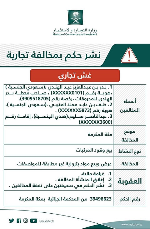 شهرت وزارة التجارة والاستثمار بمستأجرين لمحطة وقود بمكة المكرمة والعامل المسؤول من جنسية هندية وذلك إثر ثبوت مخالفتهما لنظام مكافحة الغش التجاري وعرض وبيع مواد بترولية غير مطابقة للمواصفات والمقاييس وهو ما يعد غشاً وتضليلاً للمستهلك.