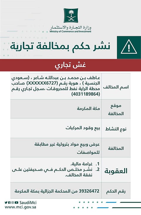 شهرت وزارة التجارة والاستثمار بصاحب محطة وقود بمكة المكرمة، وذلك إثر ثبوت مخالفة نظام مكافحة الغش التجاري وعرض وبيع مواد بترولية غير مطابقة للمواصفات والمقاييس وهو ما يعد غشاً وتضليلاً للمستهلك.
