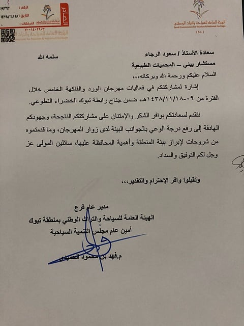 وقال مؤسس رابطة تبوك الخضراء طارق الحسين لـ "سبق" والذي زود الصحيفة بصورة من شهادة الشكر التي حصل عليها ـ الرجاء ـ رحمه الله بأنها كانت بمهرجان الورد والفاكهة العام الماضي مقدمة من مدير عام فرع الهيئة العامة للسياحة والتراث الوطني بمنطقة تبوك، لمشاركته في جناح رابطة تبوك الخضراء تطوعيًا بوصفه مستشارًا بيئيًا في المحميات الطبيعية.