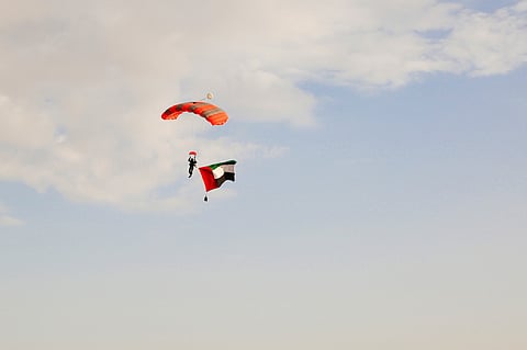 شاركت قوات الأمن الخاصة متمثلة بفريق القفز المظلي الحر بالاحتفال بذكرى اليوم الوطني السادس والأربعين لدولة الإمارات الشقيقة.