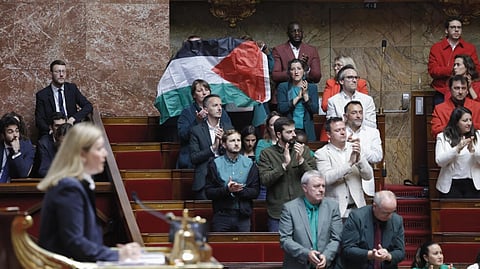 ولوحت راشيل كيكي، العضو في البرلمان عن حزب "فرنسا الأبية" عن منطقة باريس، بالعلم في بداية جلسة الأسئلة للحكومة في مجلس النواب، وفقًا لـ"فرانس برس".