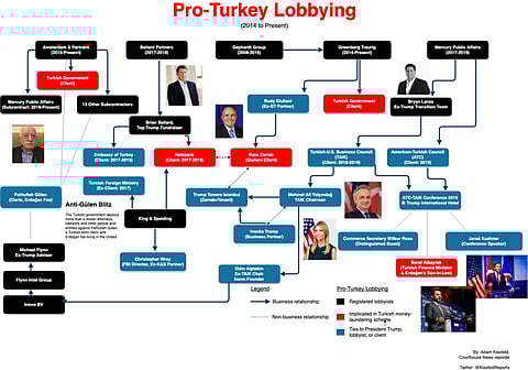 وأفاد التقرير المنشور في موقع (Courthouse News) بأن أول خمس مجموعات وشركات اللوبي التي عملت لمصلحة الحكومة التركية هيAmsterdam & Partners, Ballard Partners, Gephardt Group, Greenberg Traurig, Mercury Public Affairs. ، لافتاً إلى أن جميعها ذات علاقات قوية مع إدارة ترامب.
