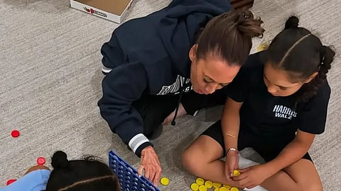 وظهرت هاريس وهي ترتدي قميص جامعة هوارد، وتجلس على الأرض تلعب مع أطفال عائلتها، بينما تحتسي كأسًا من النبيذ الأبيض.