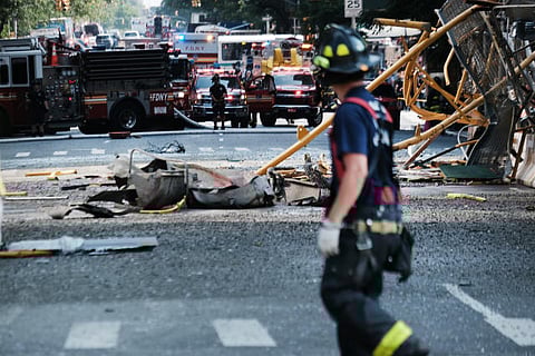 اندلع حريق في رافعة بناء على سطح مبنى شاهق في منطقة مانهاتن بمدينة نيويورك الأمريكية، وانهارت جزئيًّا على الشارع مساء الأربعاء؛ ما أدى إلى إصابة 11 شخصًا، بحسب المسؤولين الأمنيين بالمدينة.