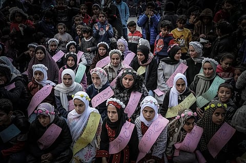 وثّقت صورةٌ نشرتها صحيفة "الجارديان" البريطانية، تكريمَ عددٍ من الطلاب والطالبات في حفل بأحد مخيمات النازحين في مدينة رفح الواقعة جنوب قطاع غزة، على الحدود المصرية.