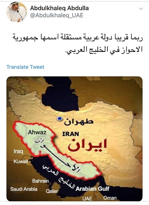 وكان الأكاديمي الإماراتي، قد غرد على حسابه في موقع التواصل الاجتماعي قائلًا: "ربما قريبًا دولة عربية مستقلة اسمها جمهورية الأحواز في الخليج العربي".