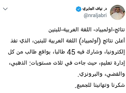 وتفصيلاً ، أجريت منافسات مسابقة أولمبياد اللغة العربية بين إدارات التعليم إلكترونياً بمشاركة طالب من كل إدارة ، وجاءت نتائج المسابقة بفوز إدارات تعليم الطائف والرياض والمخواة والجوف والحدود الشمالية والقريات وبيشة والقويعية والمهد وتبوك وحفرالباطن والأحساء والنماص والباحة ورجال ألمع ، بالمستوى الأول "الوسام الذهبي".