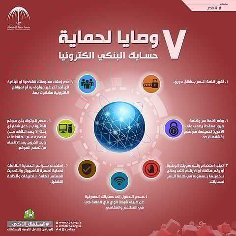 أوصت جمعية حماية المستهلك ضمن سلسلتها “لا تنخدع”، عملاء البنوك بالحرص على جعل سبع وصايا في الحسبان حين التعامل الإلكتروني مع حساباتهم البنكية، وذلك لرفع مستوى الأمان حولها وعدم ترك أي ثغرة قد يستغلها الغير وإلحاق الضرر بهم.